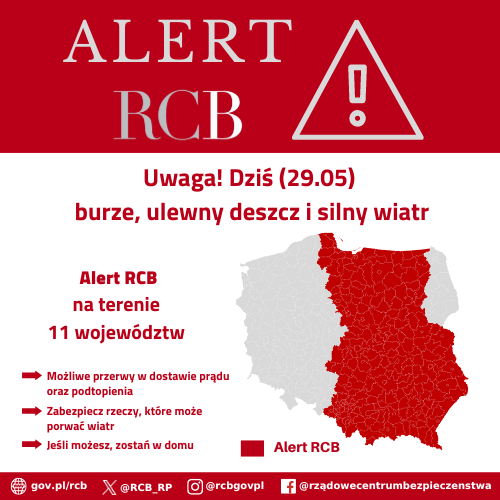 Uwaga! Dziś (29.05) prawdopodobne burze, ulewny deszcz i silny wiatr. Możliwe podtopienia. W trakcie burzy znajdź bezpieczne schronienie.” W związku z prognozami IMGW, dotyczącymi możliwości wystąpienia burz z bardzo silnymi opadami deszczu, w 11 województwach został uruchomiony Alert RCB.