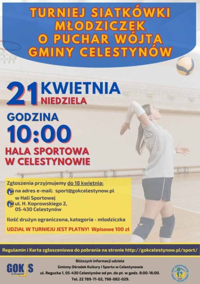 W niedzielę 21 kwietnia miłośnicy siatkówki będą mieli okazję śledzić emocjonujące rozgrywki w Celestynowie. Na boisku Gminnej Sali Gimnastycznej, zlokalizowanym przy ul. prof. Hilarego Koprowskiego 2, odbędzie się Turniej siatkówki Młodziczek o Puchar Wójta gminy Celestynów.