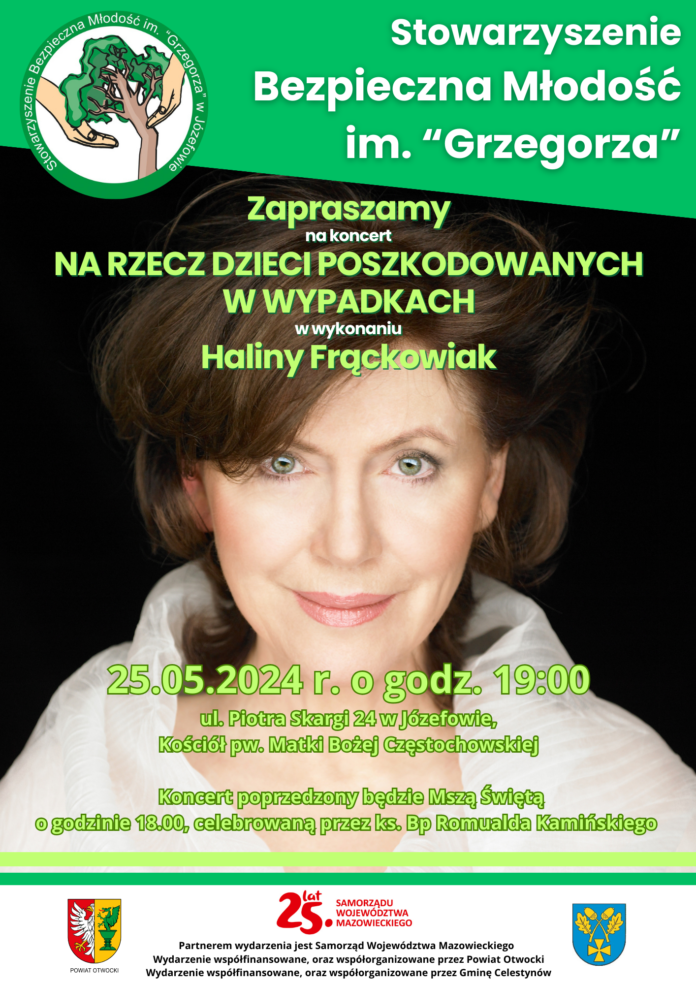 W sobotę 25 maja br. w Kościele pw. Matki Bożej Częstochowskiej w Józefowie odbędzie się koncert Stowarzyszenia Bezpieczna Młodość im. „Grzegorza” na rzecz dzieci z powiatu otwockiego poszkodowanych w wypadkach drogowych. Gwiazdą wieczoru będzie Halina Frąckowiak. W tym roku obchodzona jest jubileuszowa 15 rocznica działalności Stowarzyszenia i 16 rocznica śmierci jego Patrona Grzegorza Zduńczyka. Z okazji każdy uczestnik wydarzenia otrzyma pamiątkowe wydawnictwo prezentujące działalność Stowarzyszenia na przestrzeni ostatnich 15 lat.
