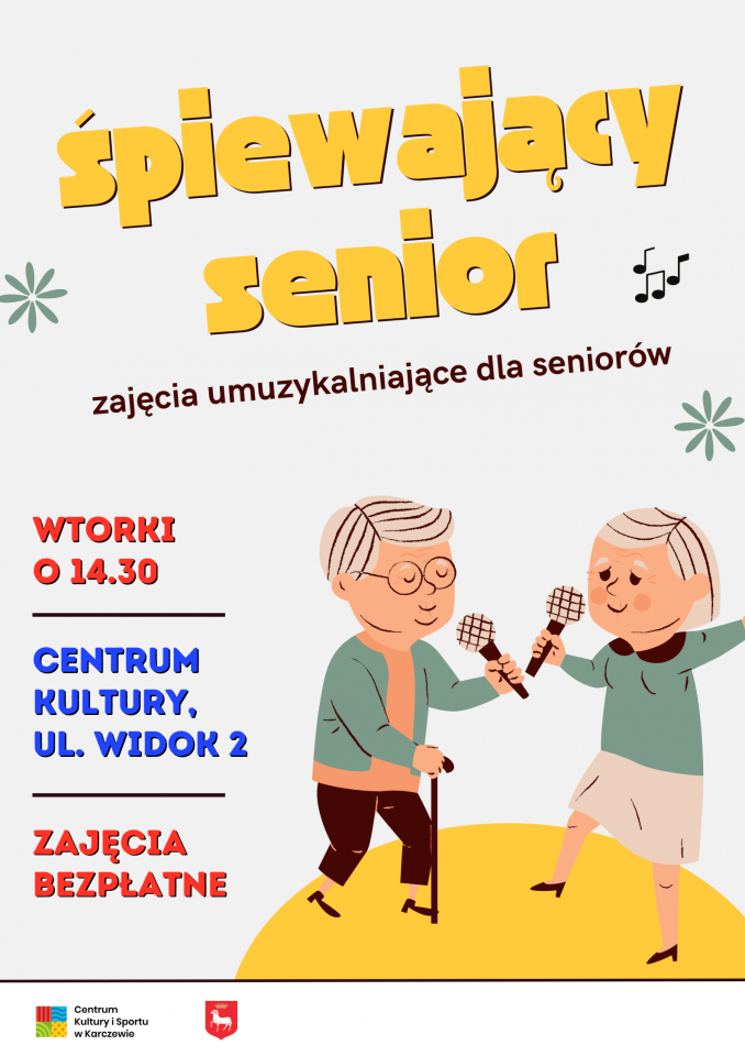 Centrum Kultury i Sportu w Karczewie zaprasza seniorów na nowy cykl zajęć umuzykalniających pt. „Śpiewający senior”. Spotkania odbywać się będą w każdy wtorek o godzinie 14:30 w siedzibie Centrum Kultury przy ul. Widok 2.