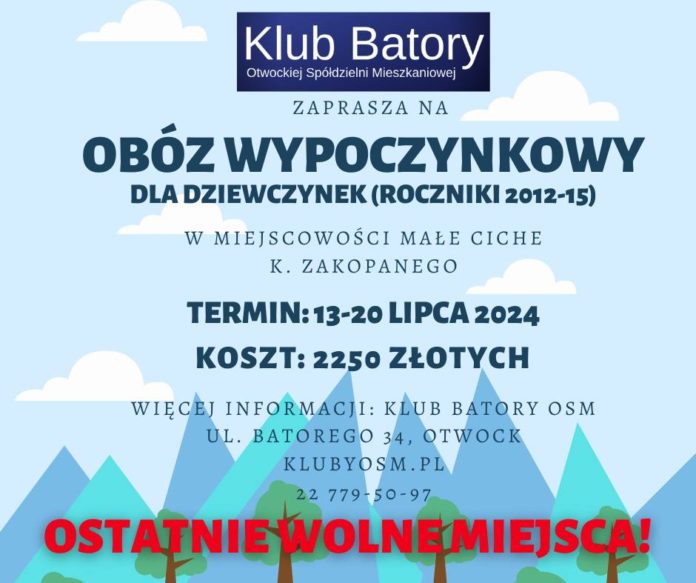 Klub Batory Otwockiej Spółdzielni Mieszkaniowej zaprasza dziewczynki z roczników 2012-2015 do wzięcia udziału w Obozie Wypoczynkowym w miejscowości Małe Ciche położonej ok 10 km. od Zakopanego. Obóz trwać będzie 8 dni (7 noclegów) od 13 lipca (wyjazd autokarem spod Klubu Batory o 7.00) do 20 lipca (powrót ok. 16.00 do Otwocka).