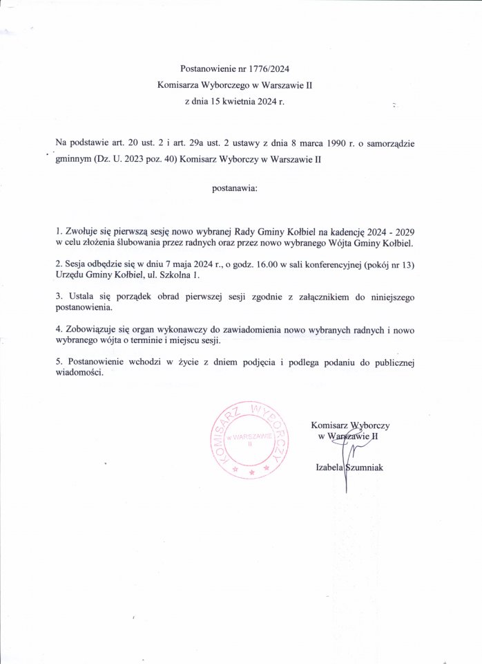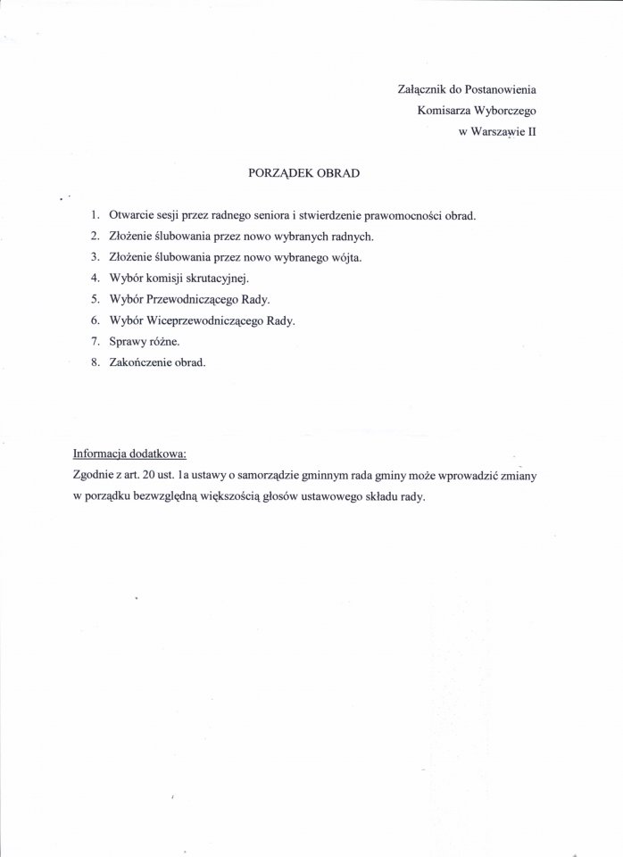 W zał. Postanowienie Komisarza Wyborczego w Warszawie ws. zwołania pierwszej sesji RG