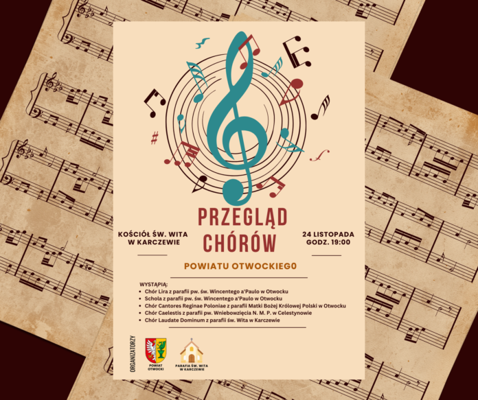 Powiat Otwocki od wielu lat organizuje przeglądy chórów działających na terenie powiatu otwockiego. W tym roku wydarzenie będzie organizowane we współpracy z Parafią pw. Św. Wita w Karczewie. Tegoroczny koncert odbędzie się 24 listopada 2024 r. po wieczornej Mszy Świętej o godz. 19.00 w Kościele pw. Św. Wita w Karczewie, przy ul. Księdza Władysława Żaboklickiego 12.