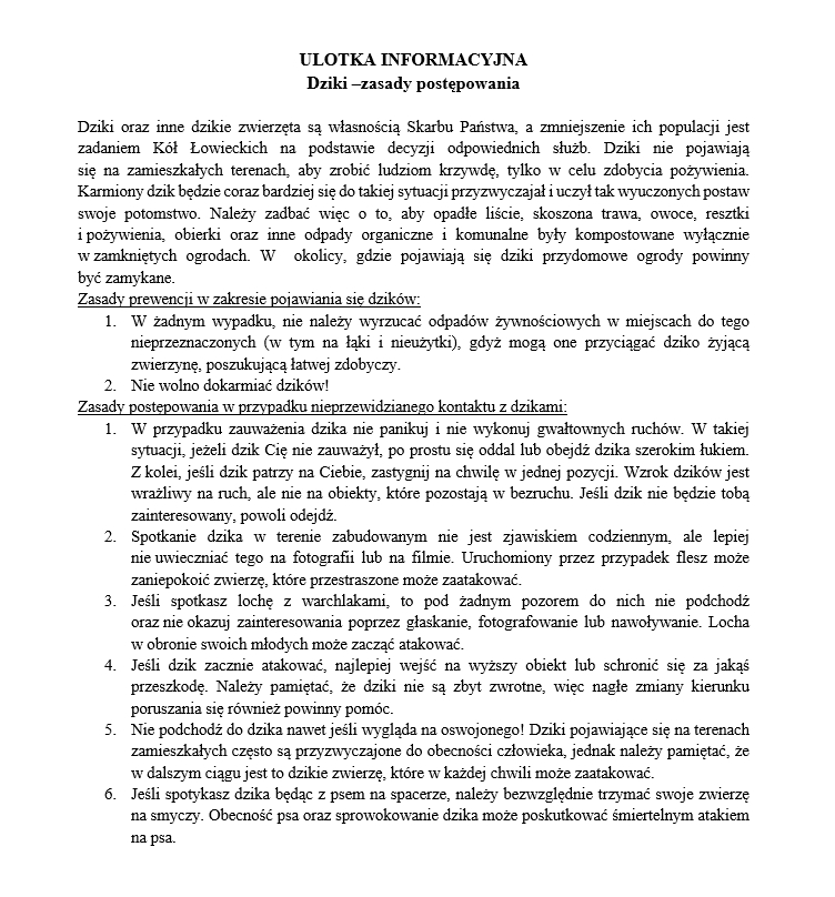 Jednocześnie informujemy, że Koło Łowieckie Nr 61 HUBERTUS, które na tym obszarze ma swój obwód, zostało poinformowane o zaistniałej sytuacji i dołożą wszelkich starań, aby dziki pozostawały w ich naturalnym środowisku, jakim jest las. Poniżej przedstawiamy ulotkę informacyjną. Zachęcamy do zapoznania się z jej treścią