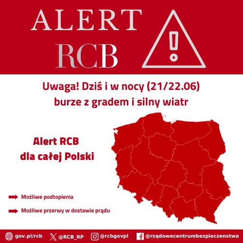 „Uwaga! Dziś i w nocy (21/22.06) burze z gradem i silny wiatr. Możliwe przerwy w dostawie prądu. Zabezpiecz rzeczy, które może porwać wiatr.”