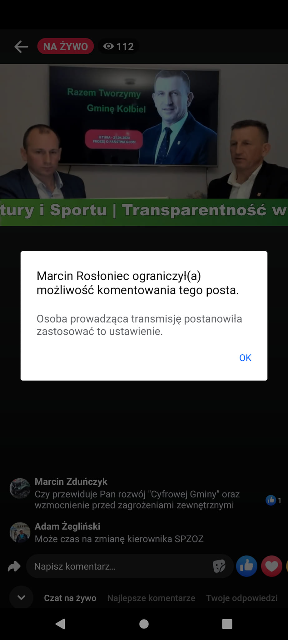 Ładna mi debata i równość słowa. Mówi Pan o policji . Jak Pan wytłumaczy brak blisko 70 policjantów i że w trakcie Pana kadencji w Gminie Sobienie Jeziory posterunek został zamknięty ? Sam Pan zatrudni osoby na brakujące etaty ? Czego zablokował Pan możliwość komentowania i zadawania pytań pod Pana Live ? Dlaczego transmisji nie ma na grupie dla wszystkich ? Tylko wybrani mogą zadac pytania?